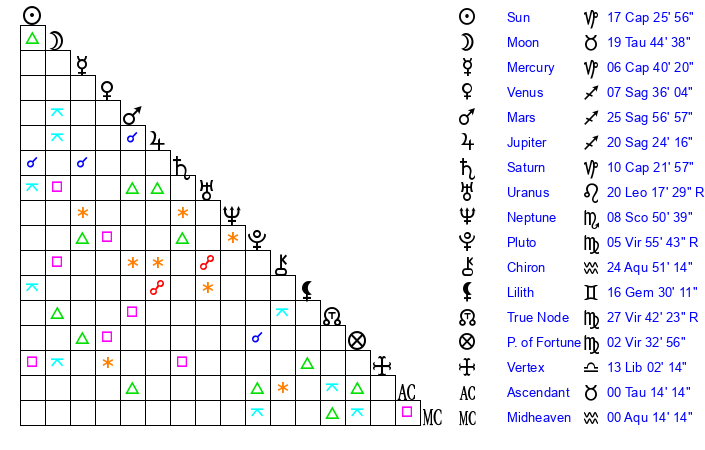 | Moon | 19 Taurus 43 | 11 Taurus 11 | 27 Virgo 37 |