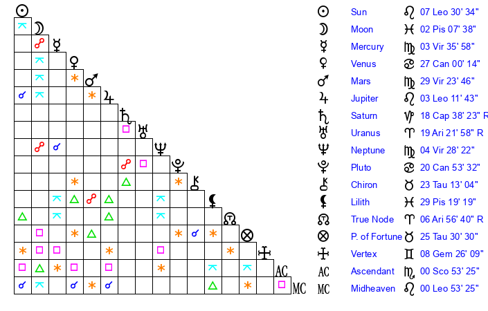 | Moon | 2 Pisces 5 | 29 Libra 51 | 1 Leo 47 |
