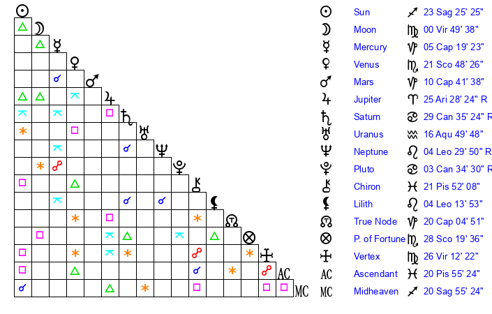 Sun | 23 Sagittarius 25 | 24 Sagittarius 13 | 12 Aries 23 |
