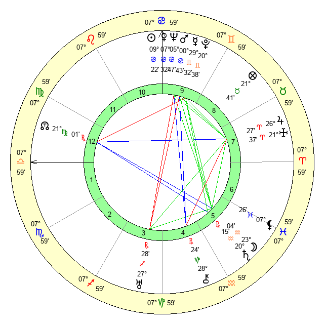 | Sun | 9 Cancer 23 | 10 Cancer 6 | 6 Scorpio 51 |