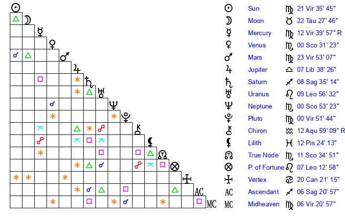 | Sun | 21 Virgo 36 | 22 Virgo 8 | 29 Scorpio 7 |