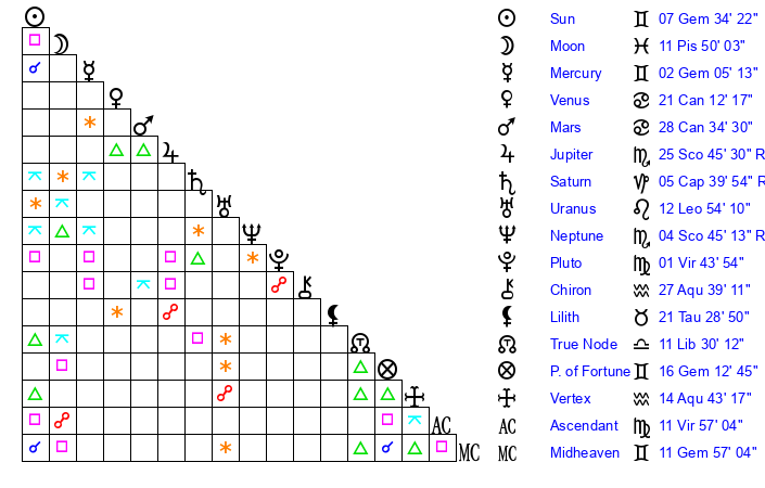 | Moon | 11 Pisces 54 | 14 Cancer 10 | 29 Cancer 59 |