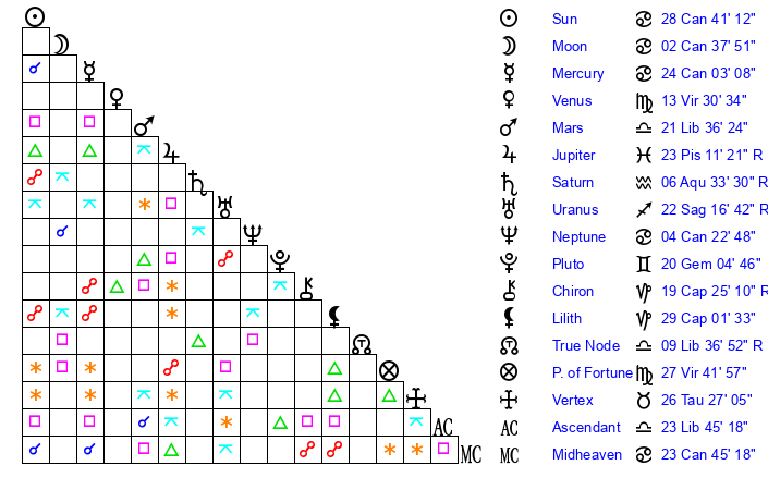 | Moon | 2 Cancer 36 | 2 Cancer 37 | 27 Sagittarius 32 |