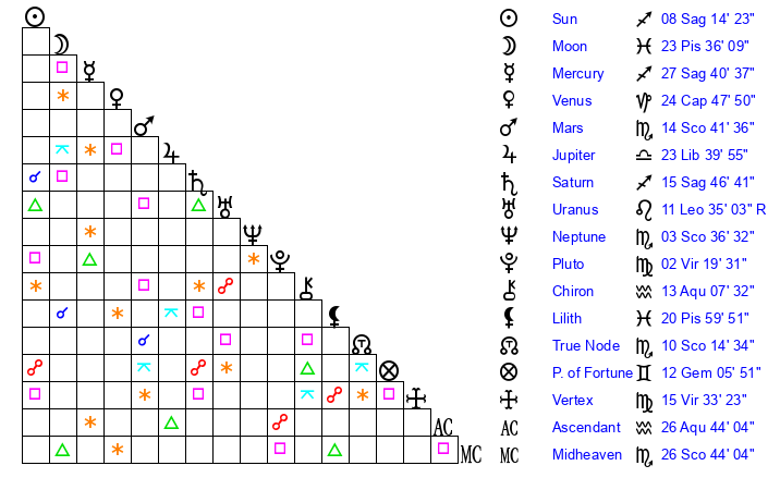 | Sun | 8 Sagittarius 14 | 8 Sagittarius 44 | 17 Aquarius 25 |