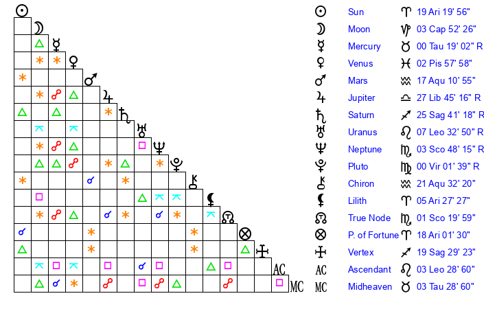 | Mercury | 0 Taurus 19 | 27 Pisces 3 | 20 Gemini 22 |