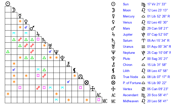 Moon | 12 Leo 26 | 14 Aries 36 | 2 Virgo 38 |