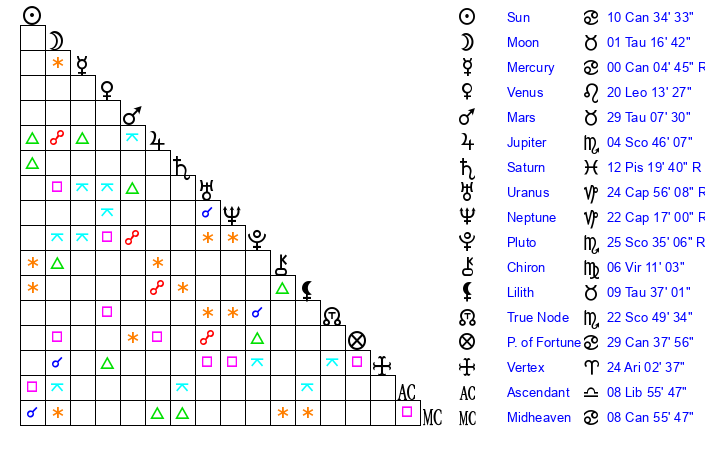 Moon | 1 Taurus 17 | 9 Libra 59 | 14 Gemini 54 |