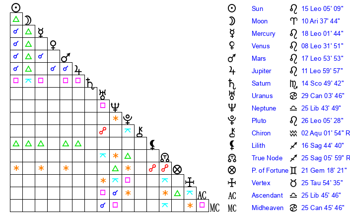 | Neptune | 25 Libra 44 | 1 Aries 51 | 27 Libra 48 |