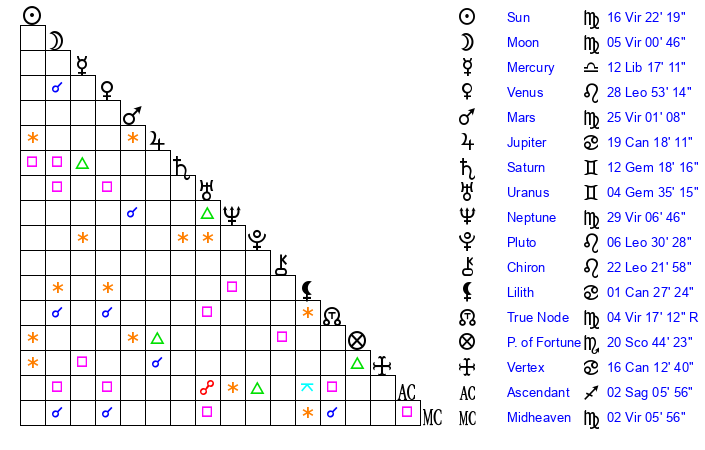 | Moon | 5 Virgo 8 | 13 Aries 24 | 16 Virgo 8 |
