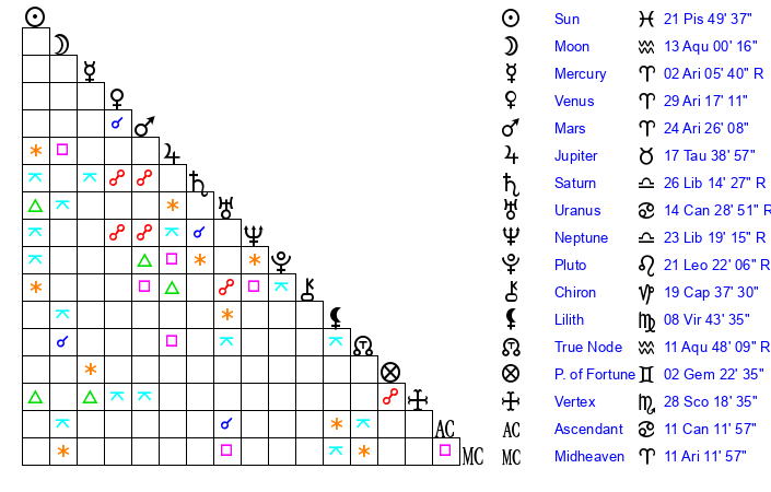 | Saturn | 26 Libra 48 | 22 Pisces 3 | 21 Libra 53 |