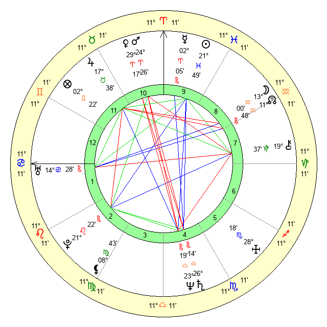 | Moon | 13 Aquarius 10 | 4 Virgo 33 | 4 Libra 15 |