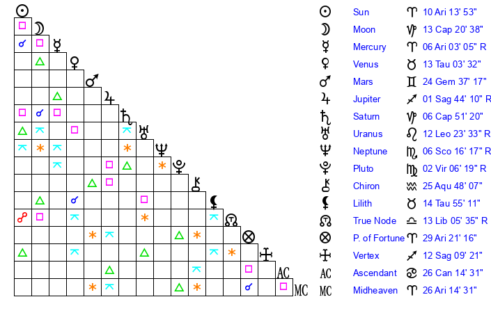 | Moon | 13 Capricorn 21 | 12 Taurus 59 | 5 Gemini 38 |