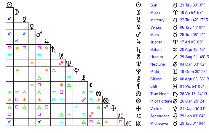 | Sun | 21 Taurus 30 | 22 Taurus 13 | 17 Virgo 32 |