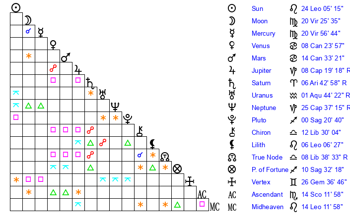 Sun | 24 Leo 5 | 24 Leo 5 | 22 Virgo 9 |