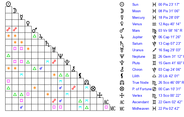 | Saturn | 13 Capricorn 36 | 19 Pisces 30 | 14 Capricorn 32 |