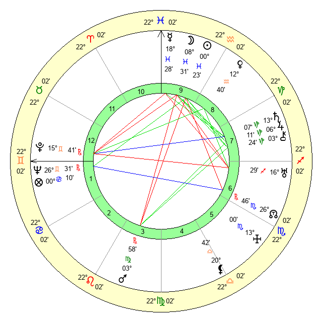 | Moon | 8 Pisces 26 | 19 Scorpio 53 | 29 Virgo 48 |