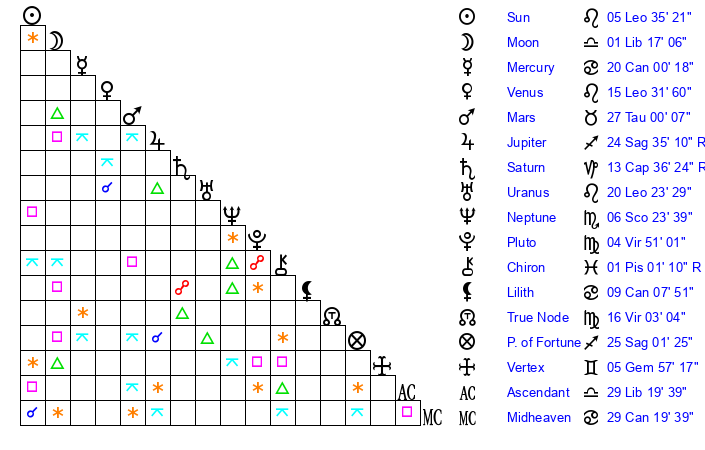 | Sun | 5 Leo 35 | 5 Leo 52 | 8 Libra 30 |