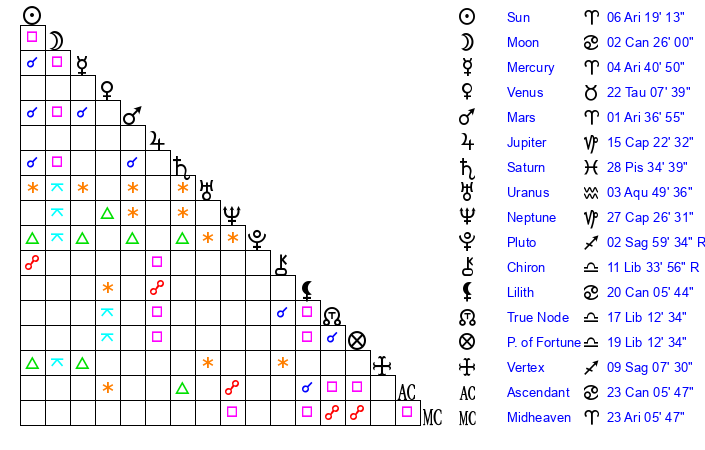 Sun | 6 Aries 19 | 6 Aries 17 | 4 Taurus 47 |