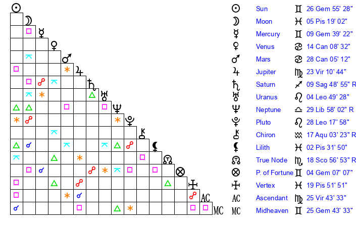 Moon | 5 Pisces 15 | 22 Pisces 56 | 1 Virgo 32 |