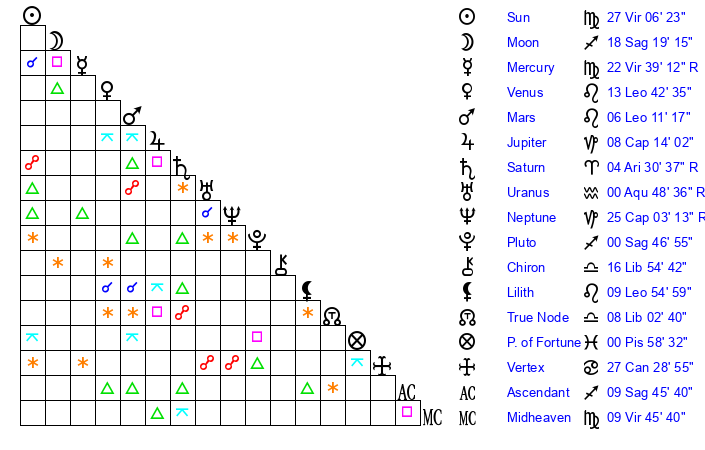 Moon | 18 Sagittarius 16 | 3 Virgo 21 | 12 Capricorn 57 |