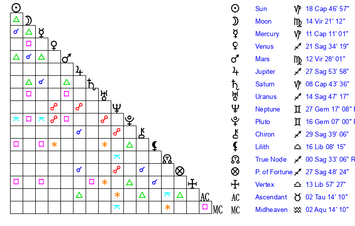 | Moon | 14 Virgo 23 | 25 Taurus 21 | 19 Pisces 18 |