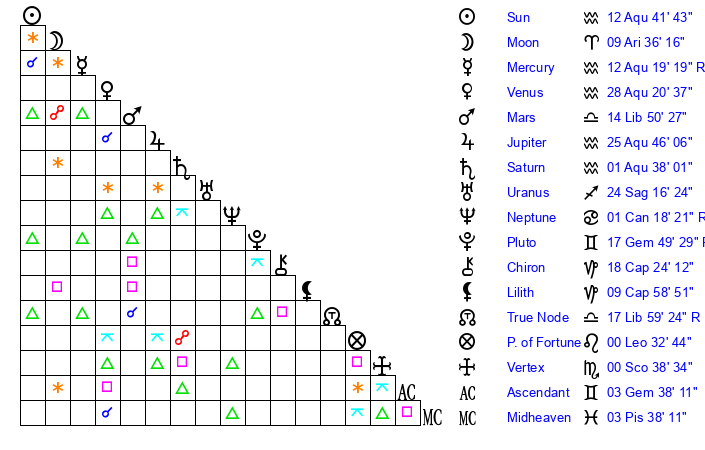 | Sun | 12 Aquarius 42 | 14 Aquarius 6 | 12 Gemini 52 |