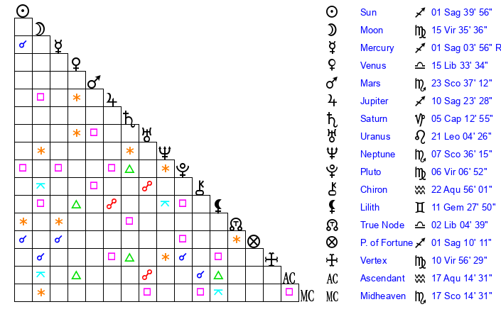 | Sun | 1 Sagittarius 40 | 2 Sagittarius 40 | 8 Aquarius 48 |