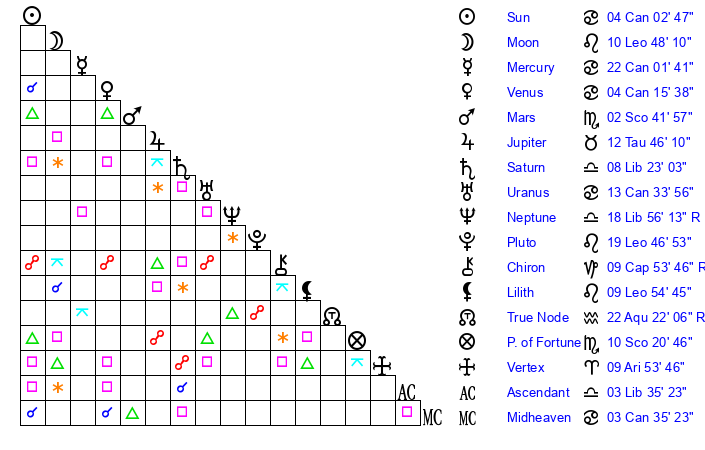 | Moon | 10 Leo 46 | 8 Cancer 1 | 19 Aries 28 |