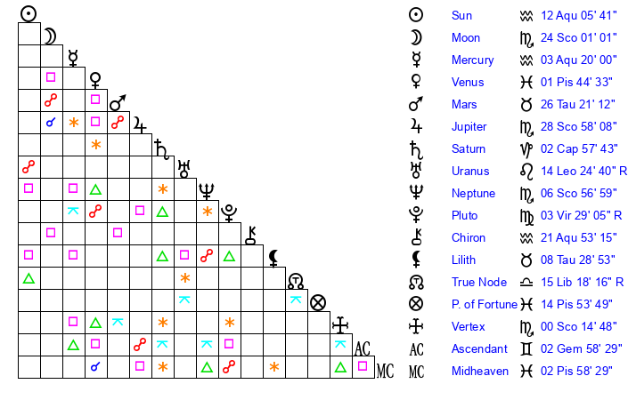 | Neptune | 6 Scorpio 56 | 27 Pisces 59 | 6 Scorpio 3 |
