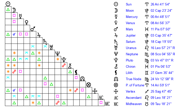 | Saturn | 18 Capricorn 39 | 26 Pisces 14 | 16 Capricorn 40 |