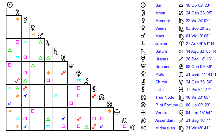 | Mars | 1 Virgo 19 | 7 Scorpio 43 | 8 Scorpio 58 |
