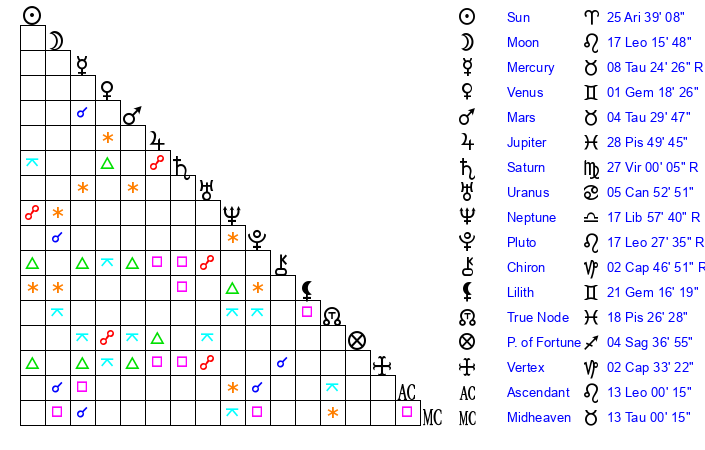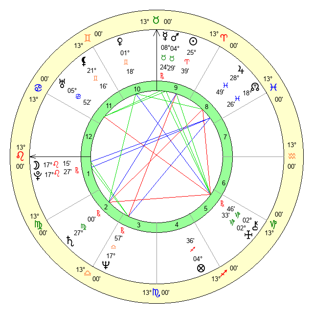 | Moon | 17 Leo 9 | 4 Sagittarius 6 | 13 Taurus 30 |