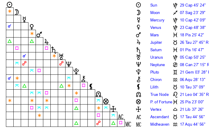 | Sun | 29 Capricorn 46 | 0 Aquarius 53 | 27 Taurus 47 |