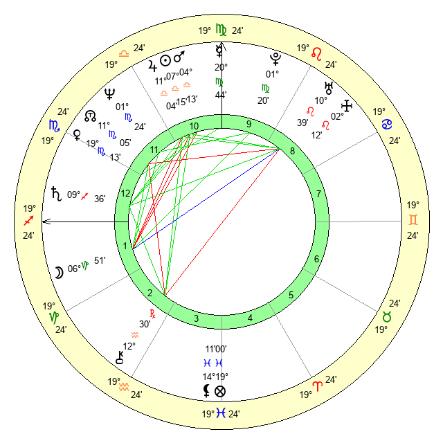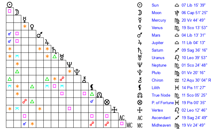 | Venus | 19 Scorpio 13 | 13 Virgo 42 | 0 Aquarius 52 |