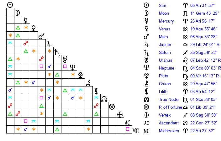 | Sun | 5 Aries 32 | 6 Aries 17 | 10 Gemini 41 |