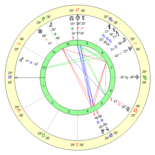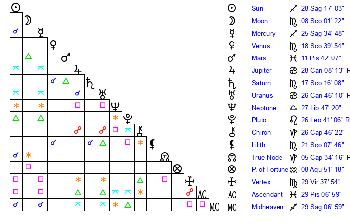 | Saturn | 17 Scorpio 43 | 25 Pisces 31 | 21 Scorpio 40 |