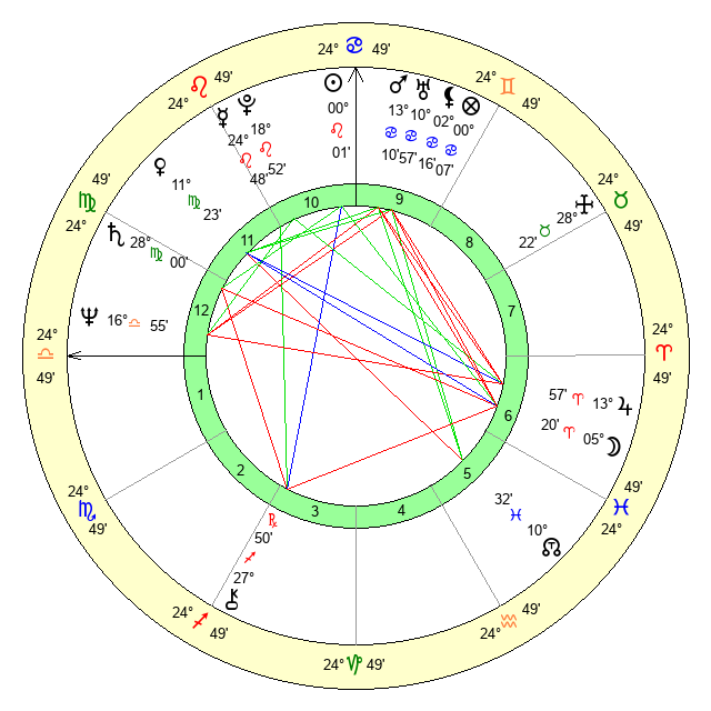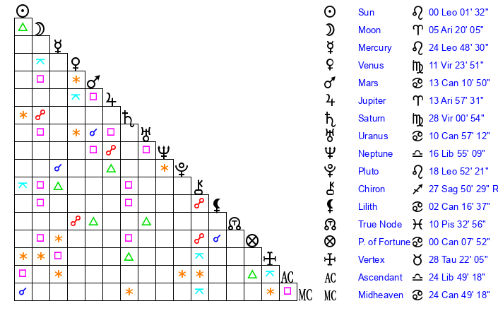 | Moon | 5 Aries 23 | 16 Cancer 48 | 11 Sagittarius 14 |
