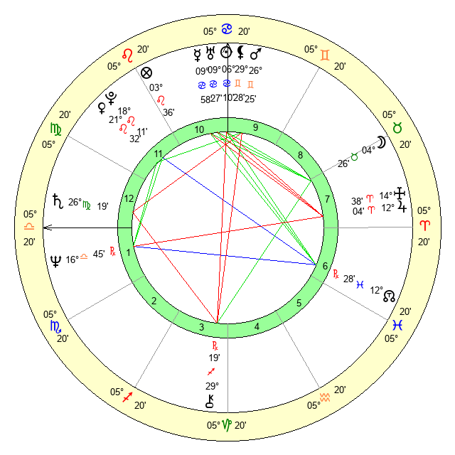 | Mercury | 9 Cancer 58 | 2 Leo 25 | 1 Virgo 41 |