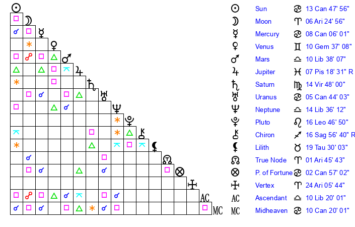 | Moon | 6 Aries 29 | 24 Scorpio 25 | 3 Capricorn 34 |