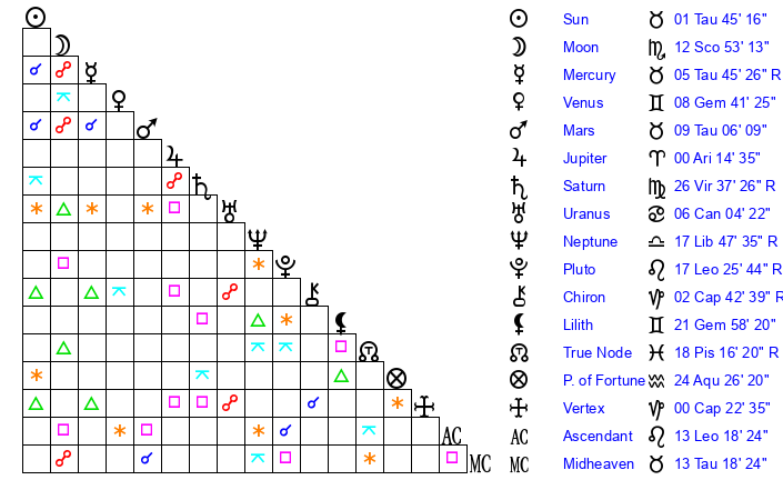 | Sun | 1 Taurus 45 | 2 Taurus 49 | 12 Cancer 51 |