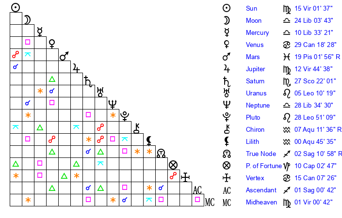 | Moon | 24 Libra 5 | 14 Pisces 39 | 21 Aries 4 |