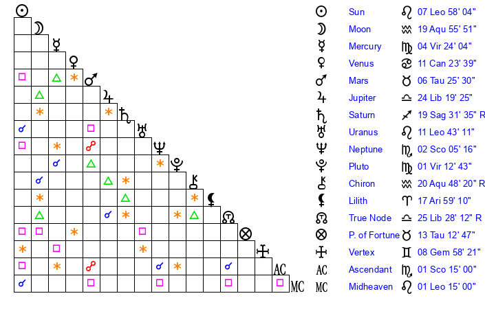 | Uranus | 11 Leo 44 | 0 Gemini 56 | 15 Leo 25 |