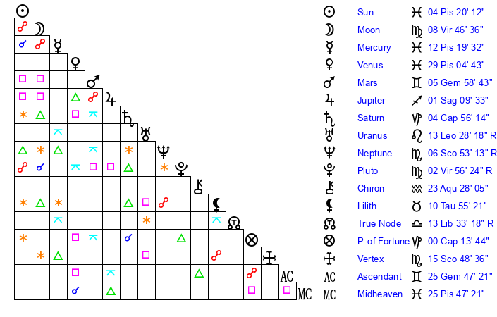 | Mercury | 12 Pisces 20 | 17 Pisces 2 | 13 Aries 0 |