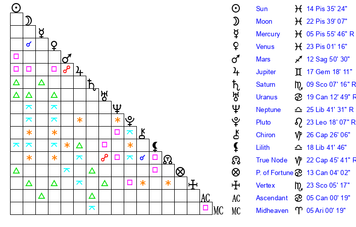 | Saturn | 9 Scorpio 39 | 21 Pisces 11 | 5 Scorpio 12 |