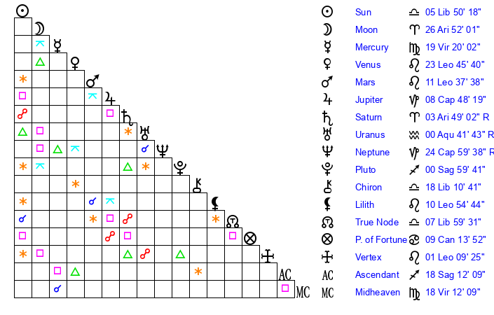 Moon | 26 Aries 49 | 21 Sagittarius 31 | 18 Taurus 34 |