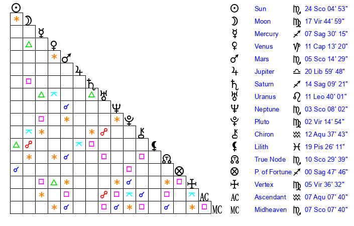 | Neptune | 3 Scorpio 8 | 29 Pisces 31 | 4 Scorpio 43 |
