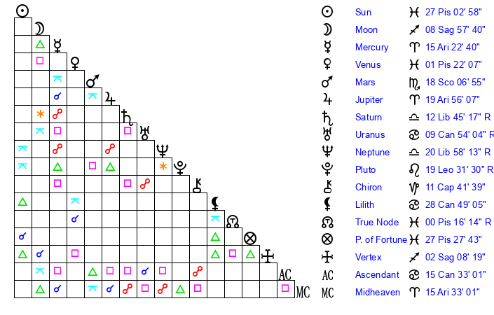 | Neptune | 20 Libra 58 | 29 Pisces 31 | 19 Libra 11 |