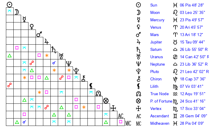 | Moon | 3 Leo 21 | 6 Aquarius 26 | 16 Pisces 53 |