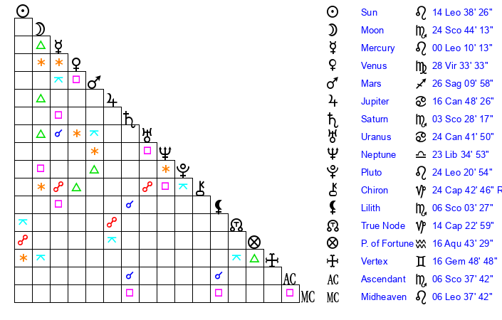 | Sun | 14 Leo 38 | 15 Leo 26 | 23 Libra 47 |