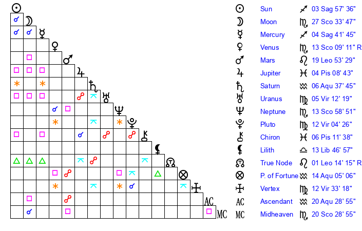| Moon | 27 Scorpio 38 | 15 Aquarius 58 | 19 Pisces 16 |